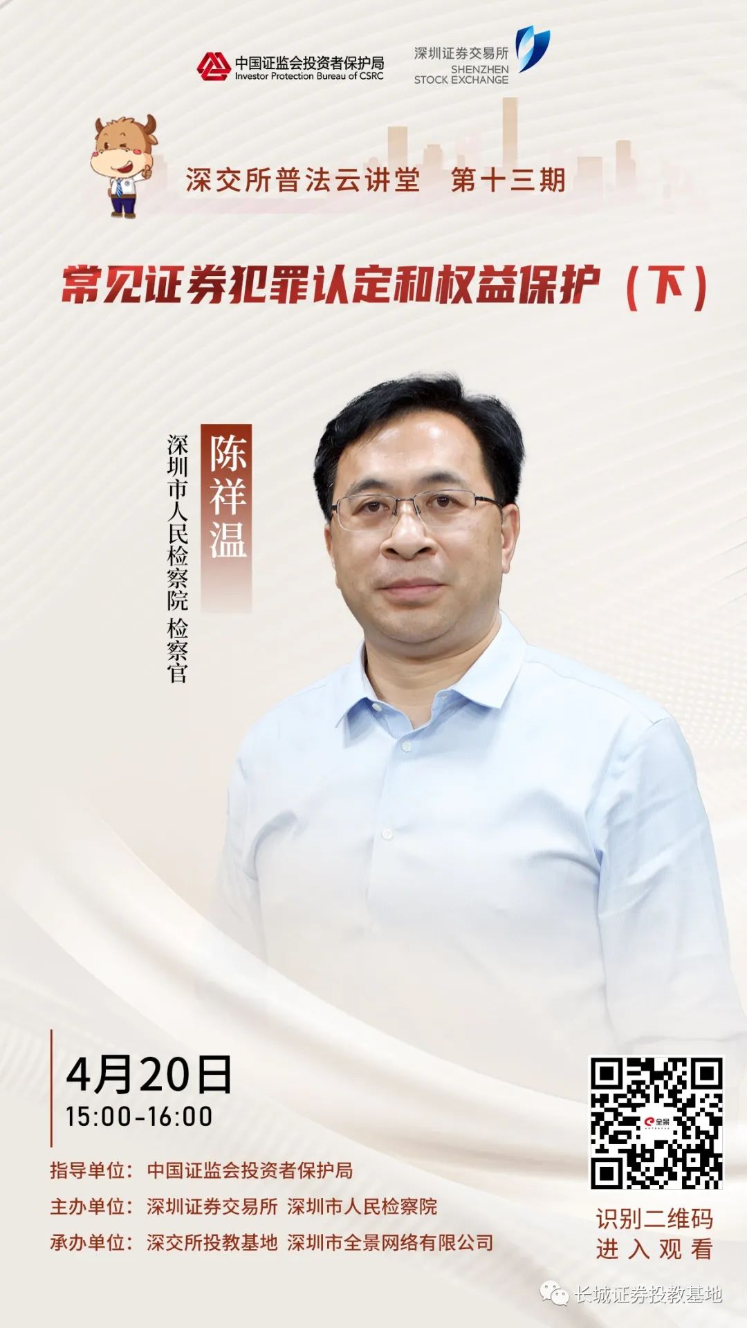 下午15:00—16:00,深交所联合深圳市人民检察院推出普法云讲堂第十三期活动,继续由深圳市人民检察院检察官陈祥温为投资者分享常见的证券犯罪行为的认定和投资者如何维护自身权益,欢迎感兴趣的投资者关注收看,谢谢!