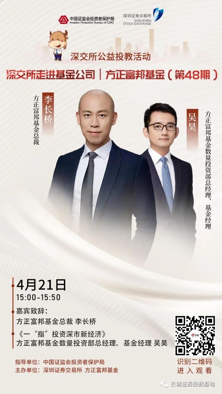 今天4月21日下午15:00-15:50,深交所投资者服务季推出第48期“走进基金公司——方正富邦基金”活动,(1)邀请方正富邦基金总裁李长桥介绍公司情况;(2)邀请方正富邦基金数量投资部总经理、基金经理 吴昊带来《一“指”投资深市新经济》,欢迎感兴趣的投资者关注收看,谢谢!