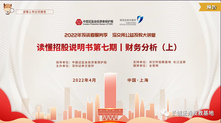 4月22日(周五)下午3点,深交所特别推出《读懂招股说明书》系列节目第七期,邀请到长江保荐质量控制部业务总监王江豫为投资者讲解阅读招股说明书时的财务分析技巧,帮助投资者了解发行人的财务经营状况,帮助投资者掌握阅读招股说明书的技巧,推动投资者形成阅读招股说明书的习惯,欢迎感兴趣的投资者关注收看,谢谢!