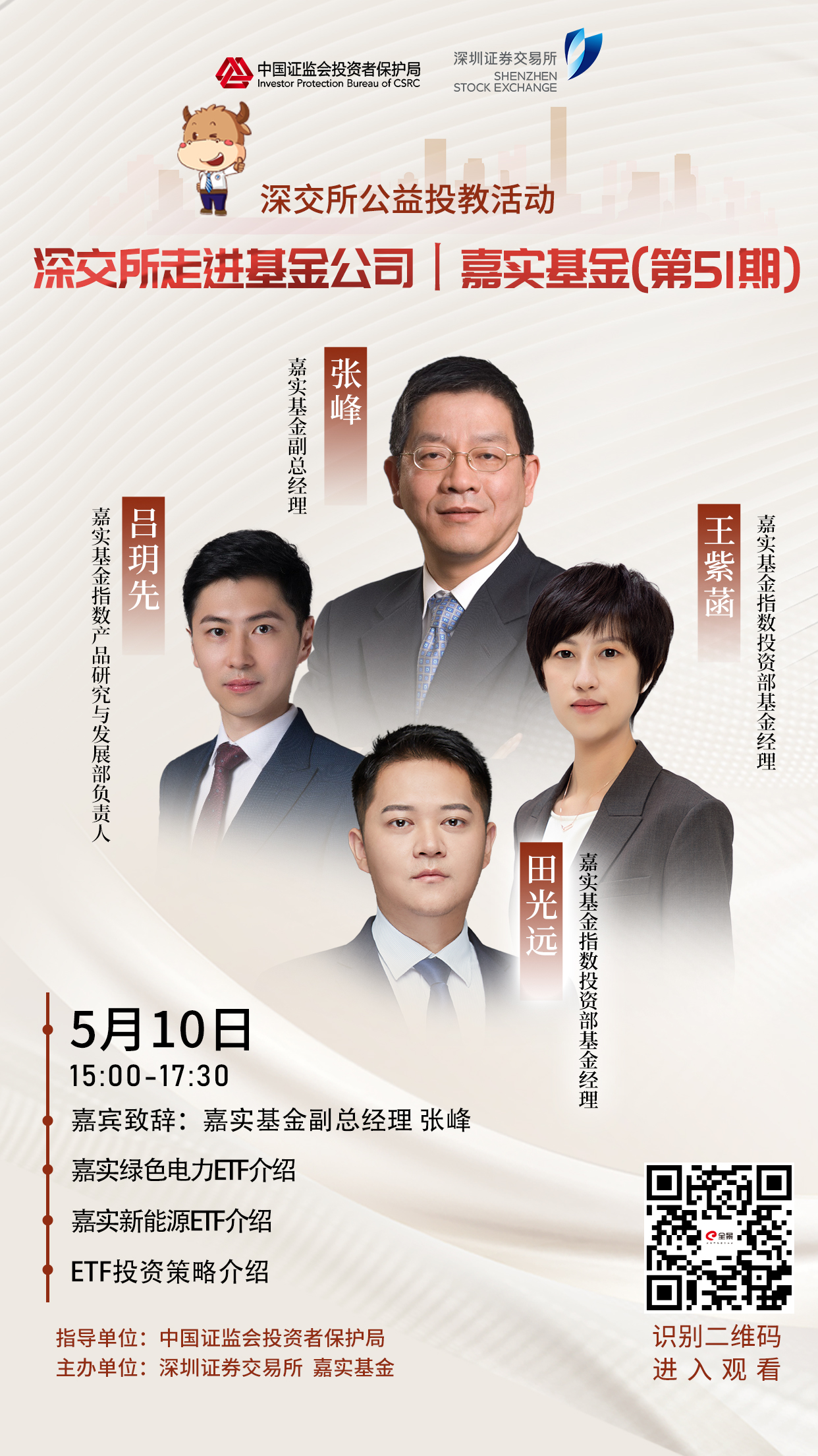 今天5月10日(周二)下午15:00-17:30,深交所投资者服务季推出第51期“走进基金公司——嘉实基金”活动,欢迎感兴趣的投资者关注收看,谢谢!
