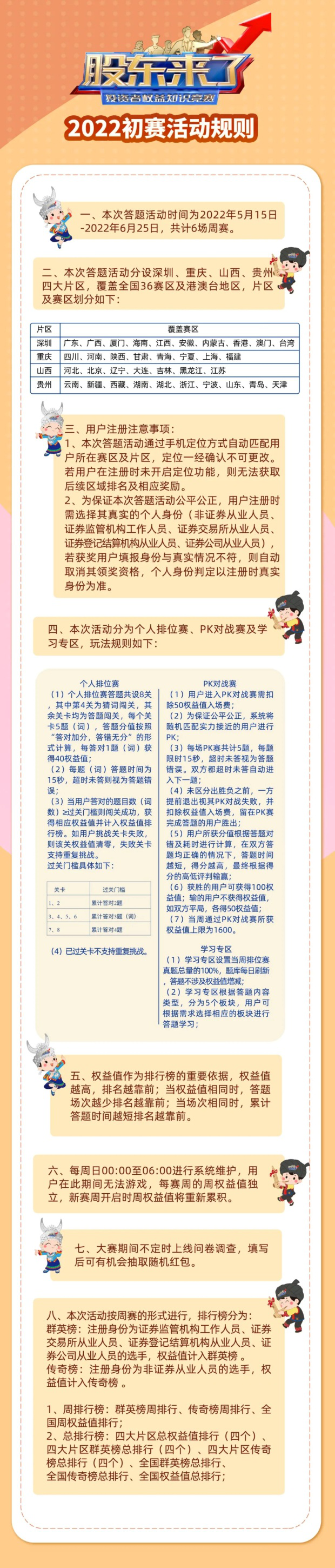 第五届《股东来了》答题活动已正式开幕!本次答题活动时间为2022年5月15日-2022年6月25日,共计6场周赛。本次答题活动分设深圳、重庆、山西、贵州四大片区,深圳赛区属于深圳片区。