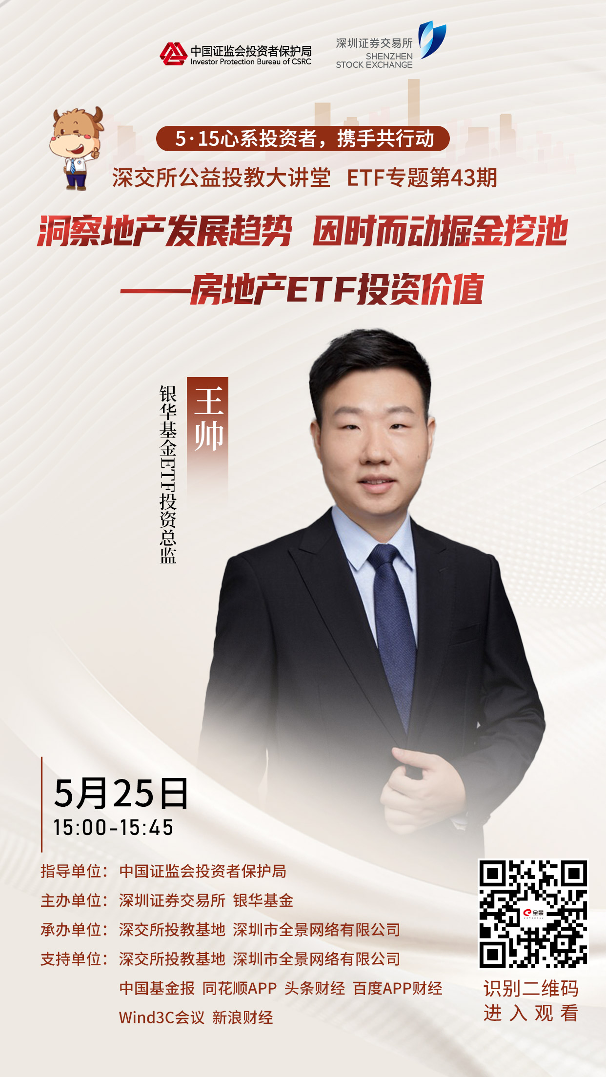 5月25日(周三)下午15:00-15:45,深交所推出投教大讲堂(ETF专题第43期),邀请银华基金ETF投资总监王帅分享《洞察地产发展趋势 因时而动掘金挖池——房地产ETF投资价值》投资观点,欢迎感兴趣的投资者关注收看!