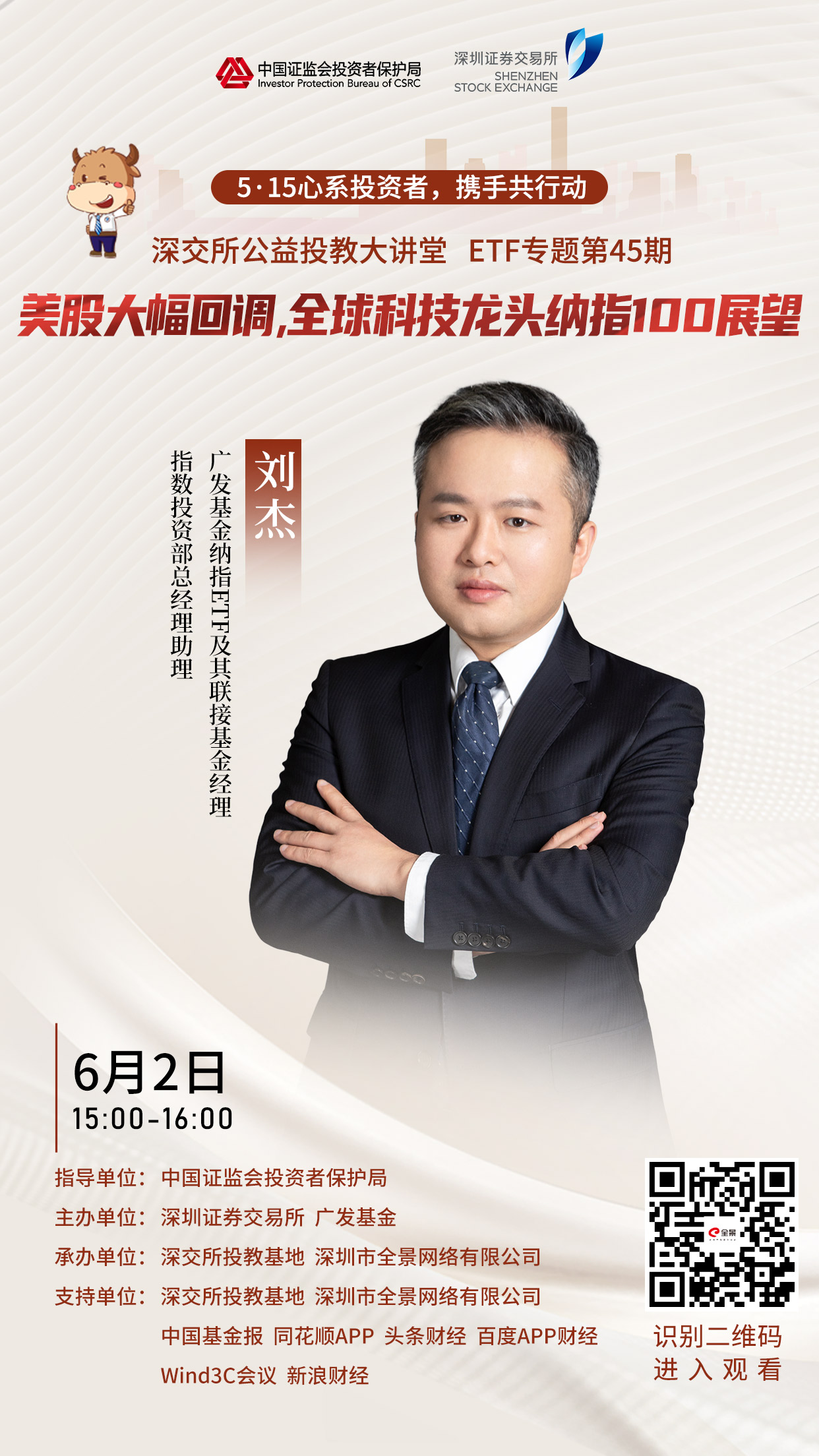 6月2日(今日)下午15:00-16:00,深交所推出投教大讲堂(ETF专题第45期),邀请任广发基金纳指ETF及其联接基金经理、指数投资部总经理助理刘杰分享《美股大幅回调,全球科技龙头纳指100展望》投资观点,欢迎感兴趣的投资者关注收看!