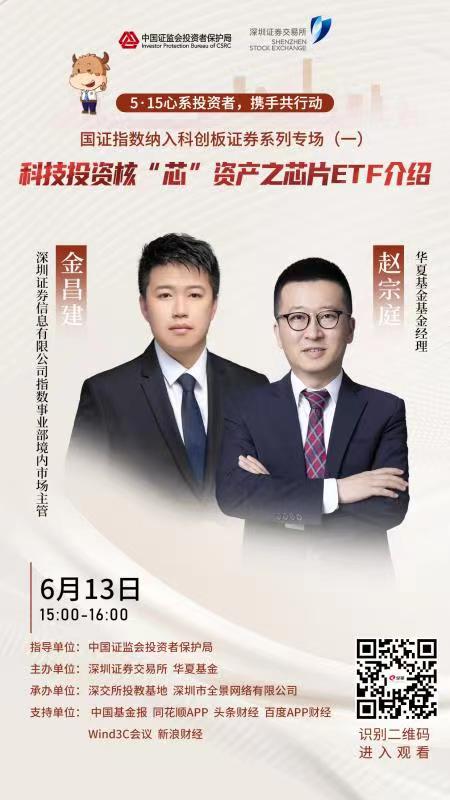 为此,深交所特开展系列专场投教活动,6月13日(周一)下午15:00-16:00开展第一场活动,邀请深证信息指数事业部金昌建介绍相关情况,华夏基金基金经理赵宗庭分享芯片ETF投资观点,欢迎感兴趣的投资者关注收看!