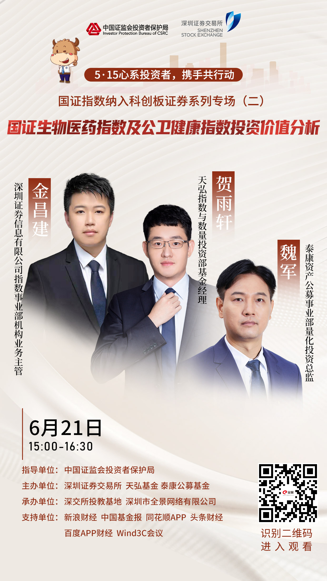 6月21日(周二)下午15:00-16:30,深交所开展“国证指数纳入科创板证券”系列专场第2场活动。活动邀请深证信息指数事业部金昌建介绍相关情况、天弘基金指数与数量投资部基金经理贺雨轩分享国证生物医药指数投资观点、泰康资产公募事业部量化投资总监魏军分享公卫健康指数投资观点,欢迎感兴趣的投资者关注收看!