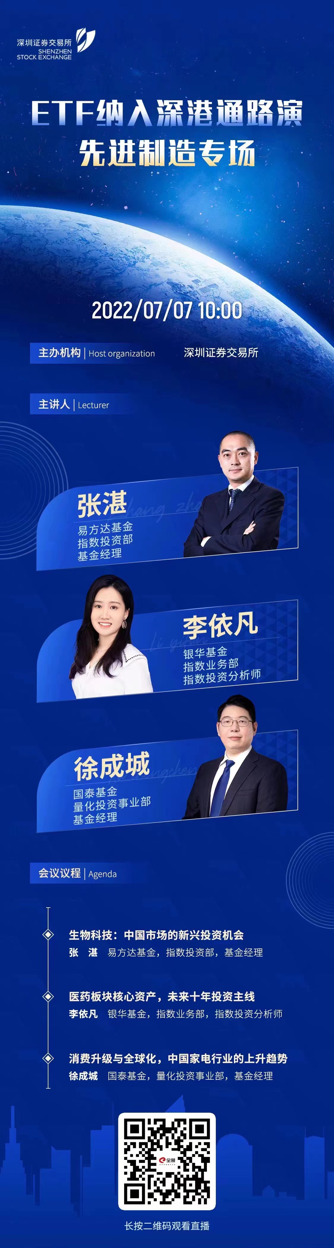 7月7日(周四)上午10:00-11:00,邀请易方达基金、银华基金、国泰基金带来《ETF纳入深港通路演(先进制造专场)》相关情况,欢迎感兴趣的投资者关注收看!