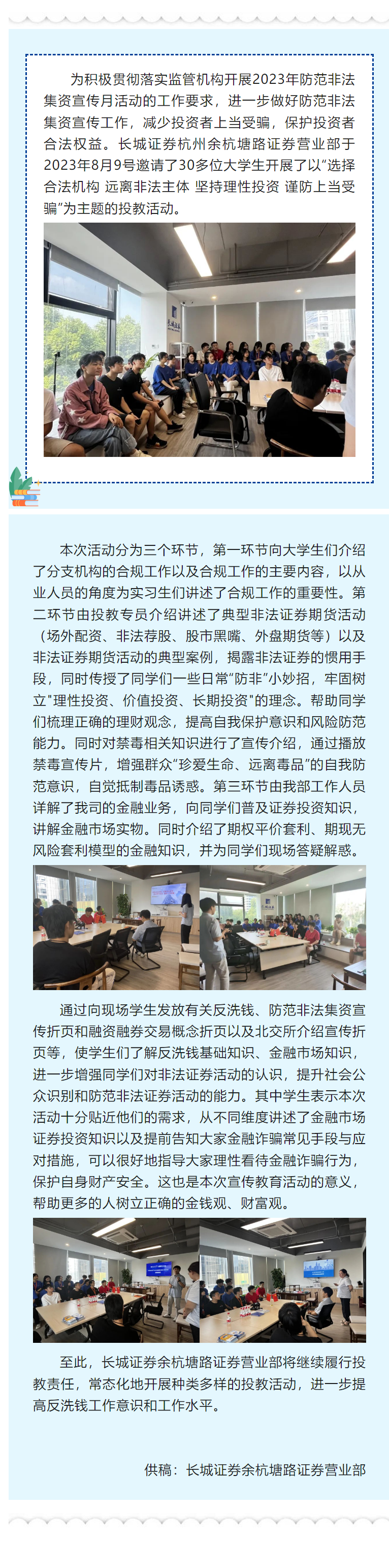 【城·活动】长城证券杭州余杭塘路证券营业部开展防范非法集资宣传教育活动
